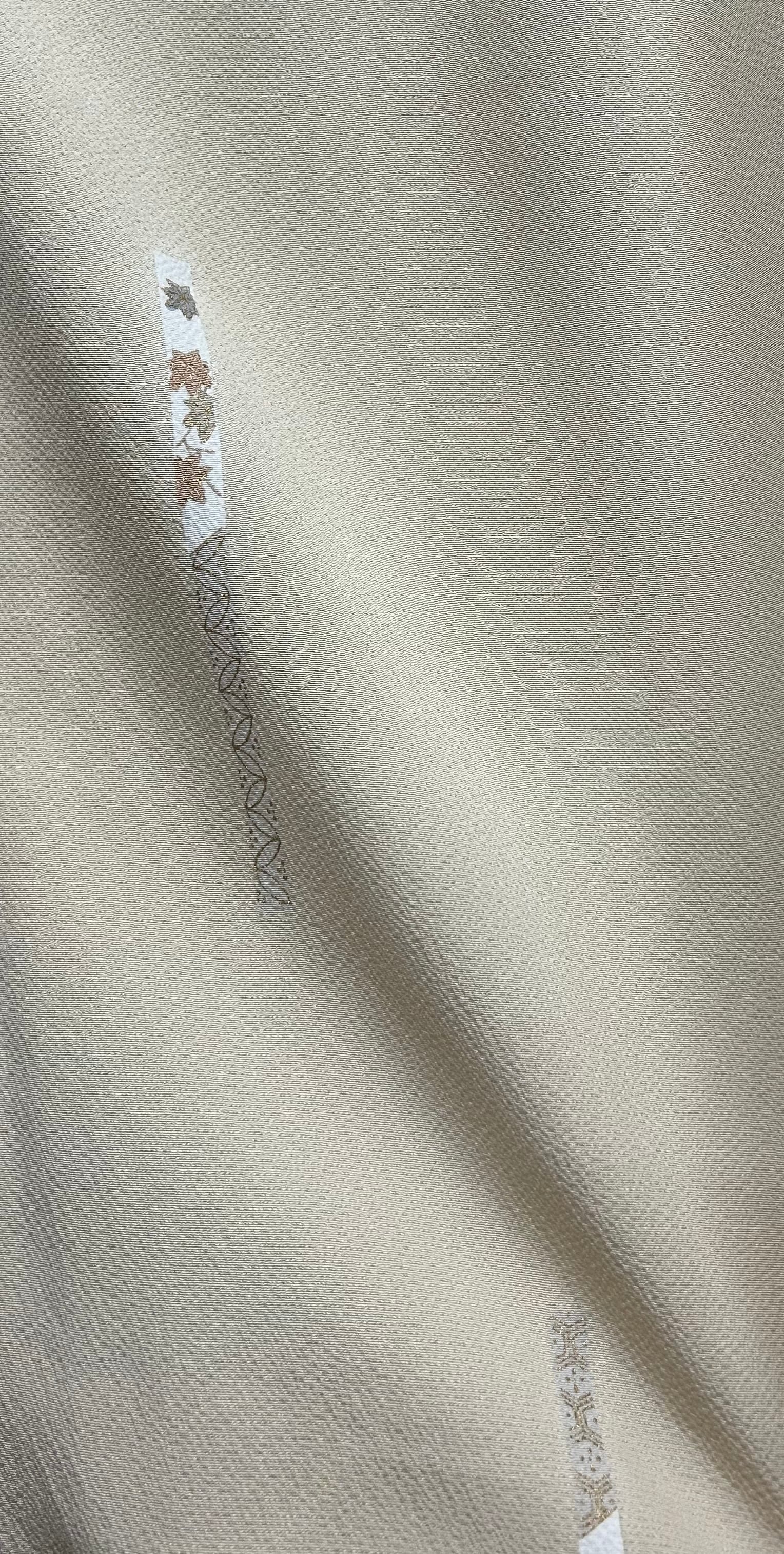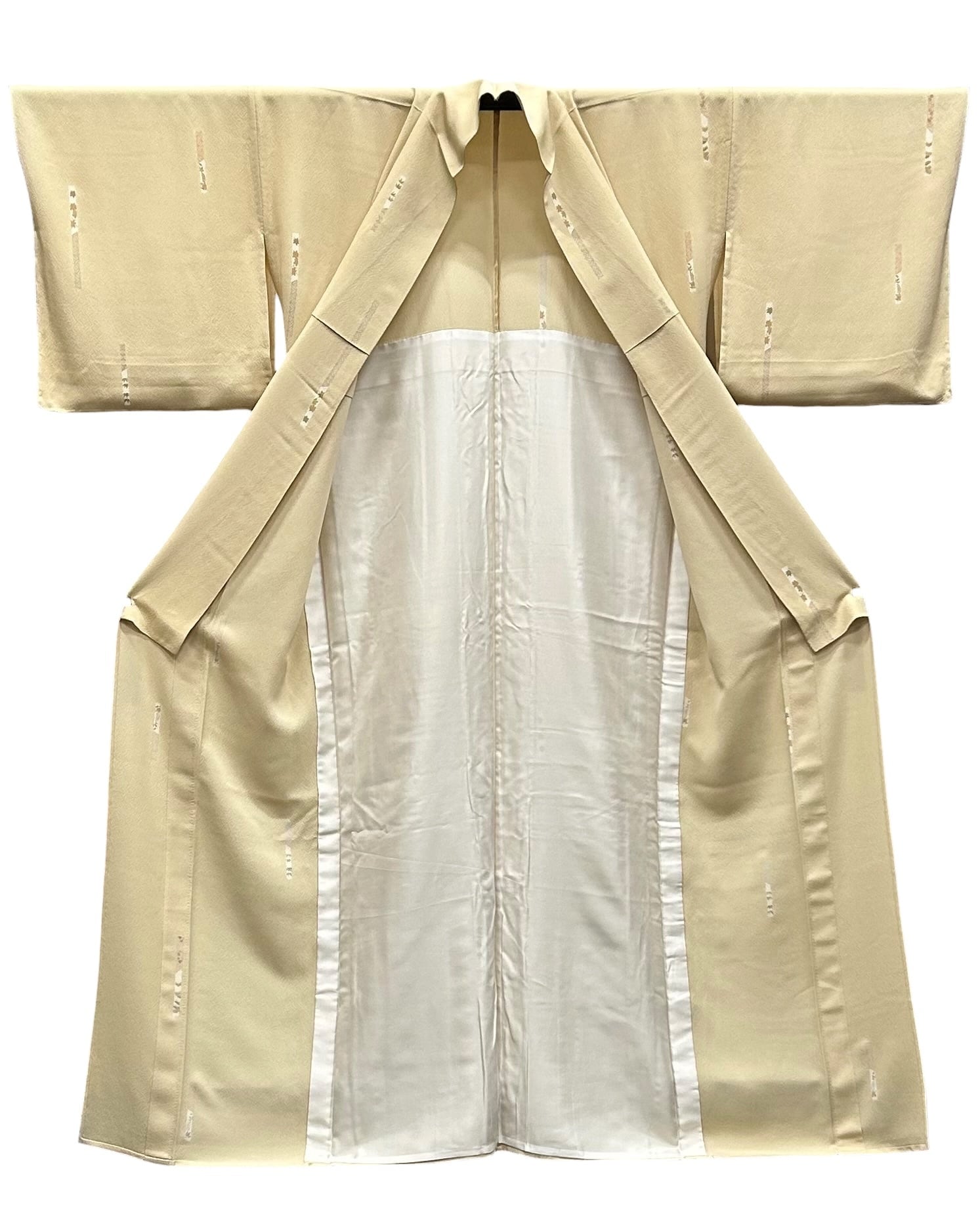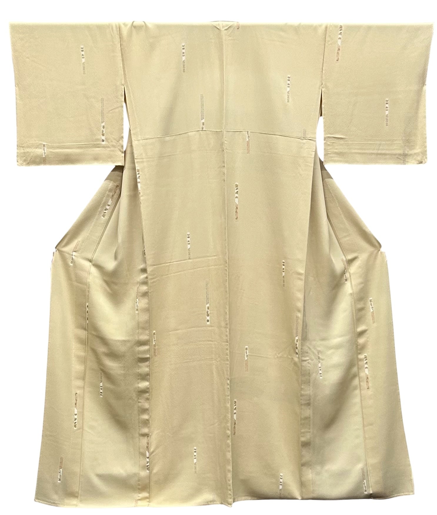 黄味がかった飴色の地に、少し金の入った吉祥文様の細い短冊のような飛び柄小紋です。