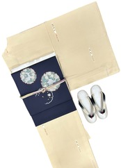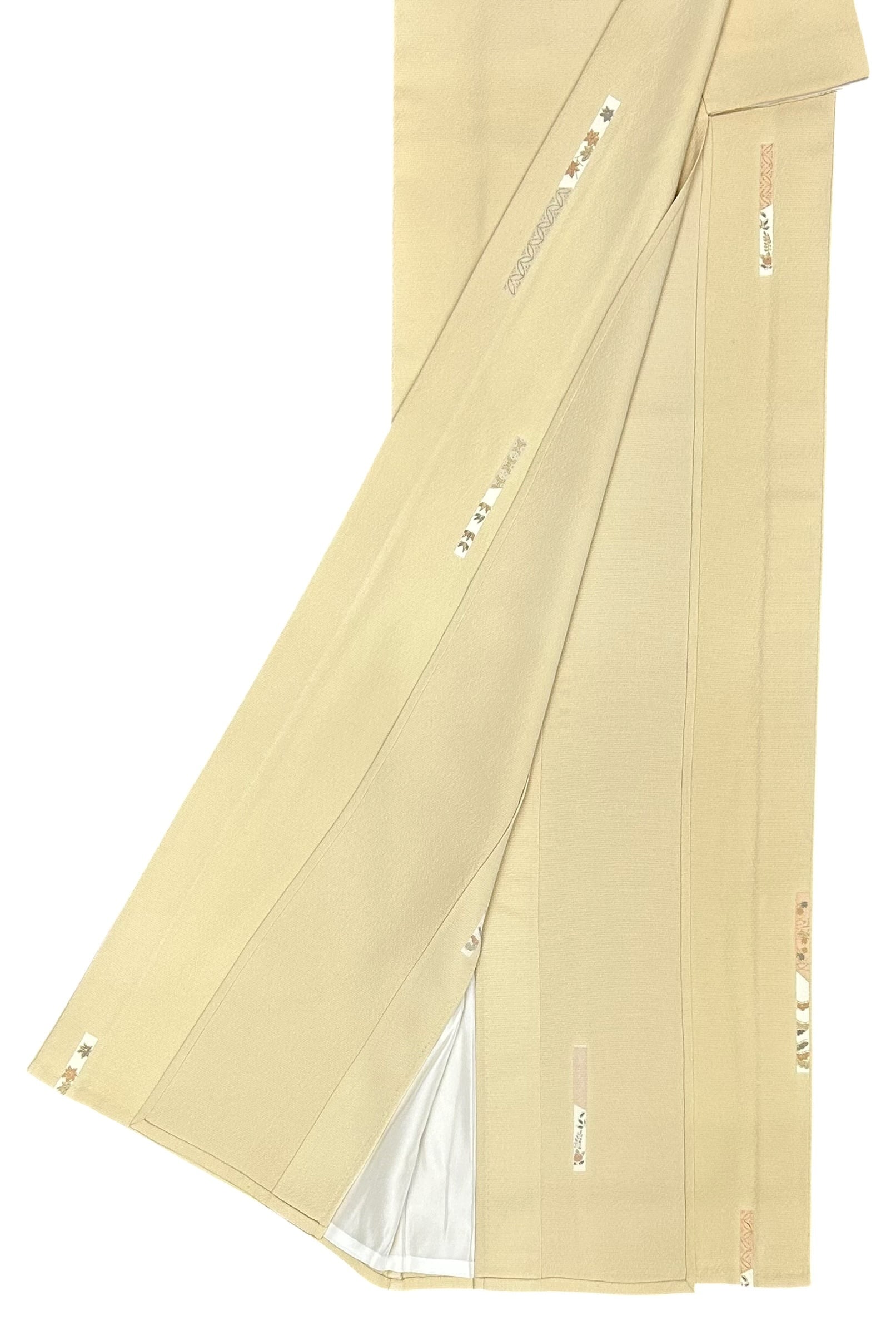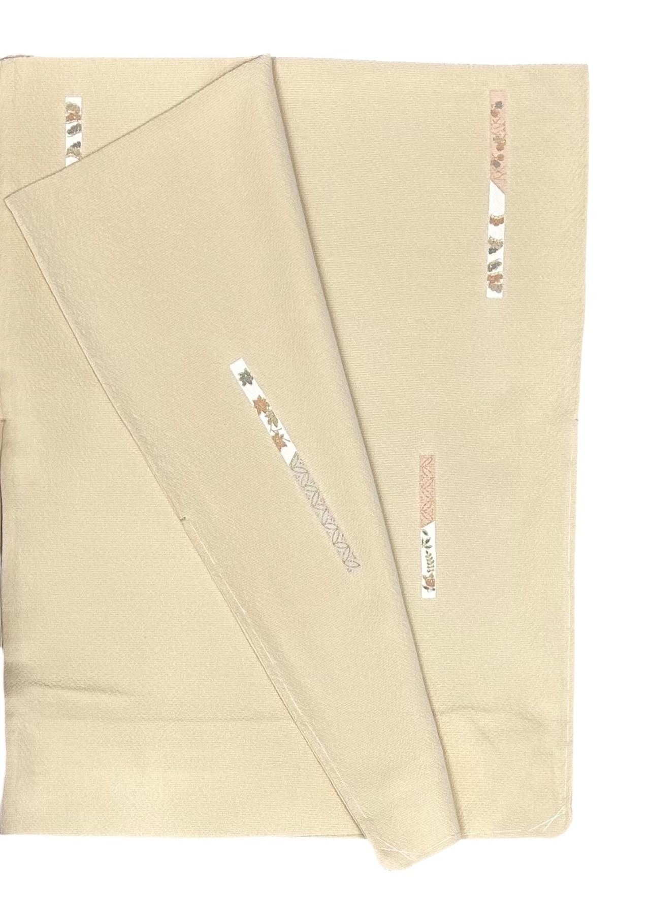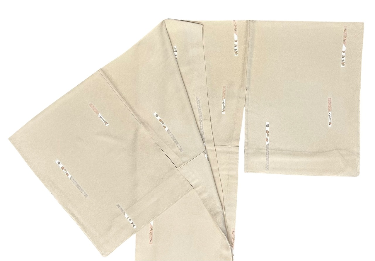 黄味がかった飴色の地に、少し金の入った吉祥文様の細い短冊のような飛び柄小紋です。