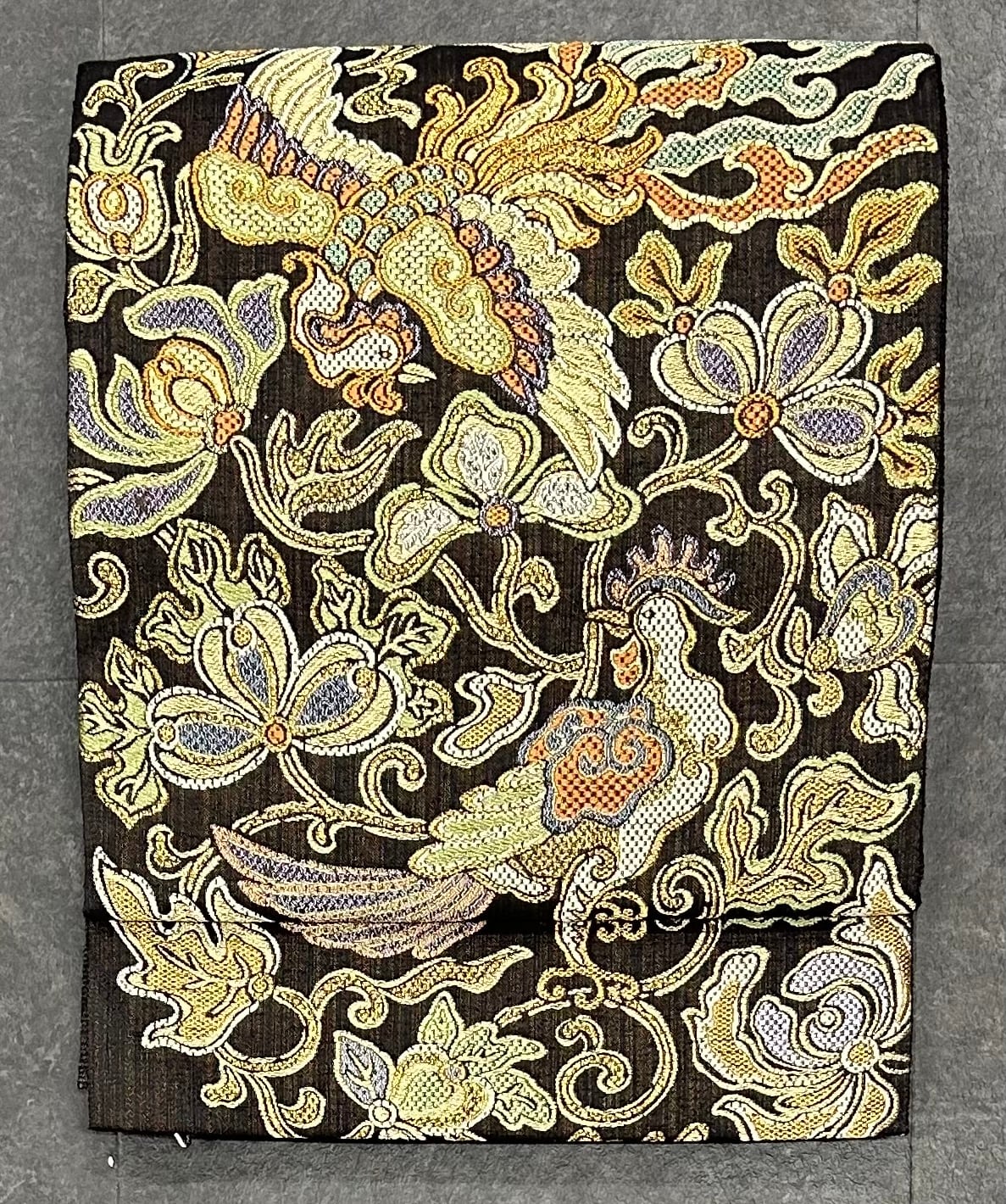 袋帯 六通 赤墨色×黒紅色 鳳凰 長さ442cm Q4393