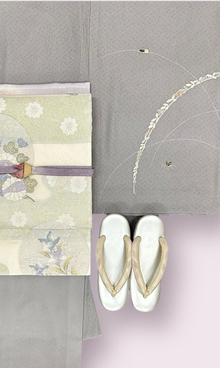 抑えた銀色の丸に紫系の秋草文様。シャリっとして程よい張りのある上品さ漂うお品。
