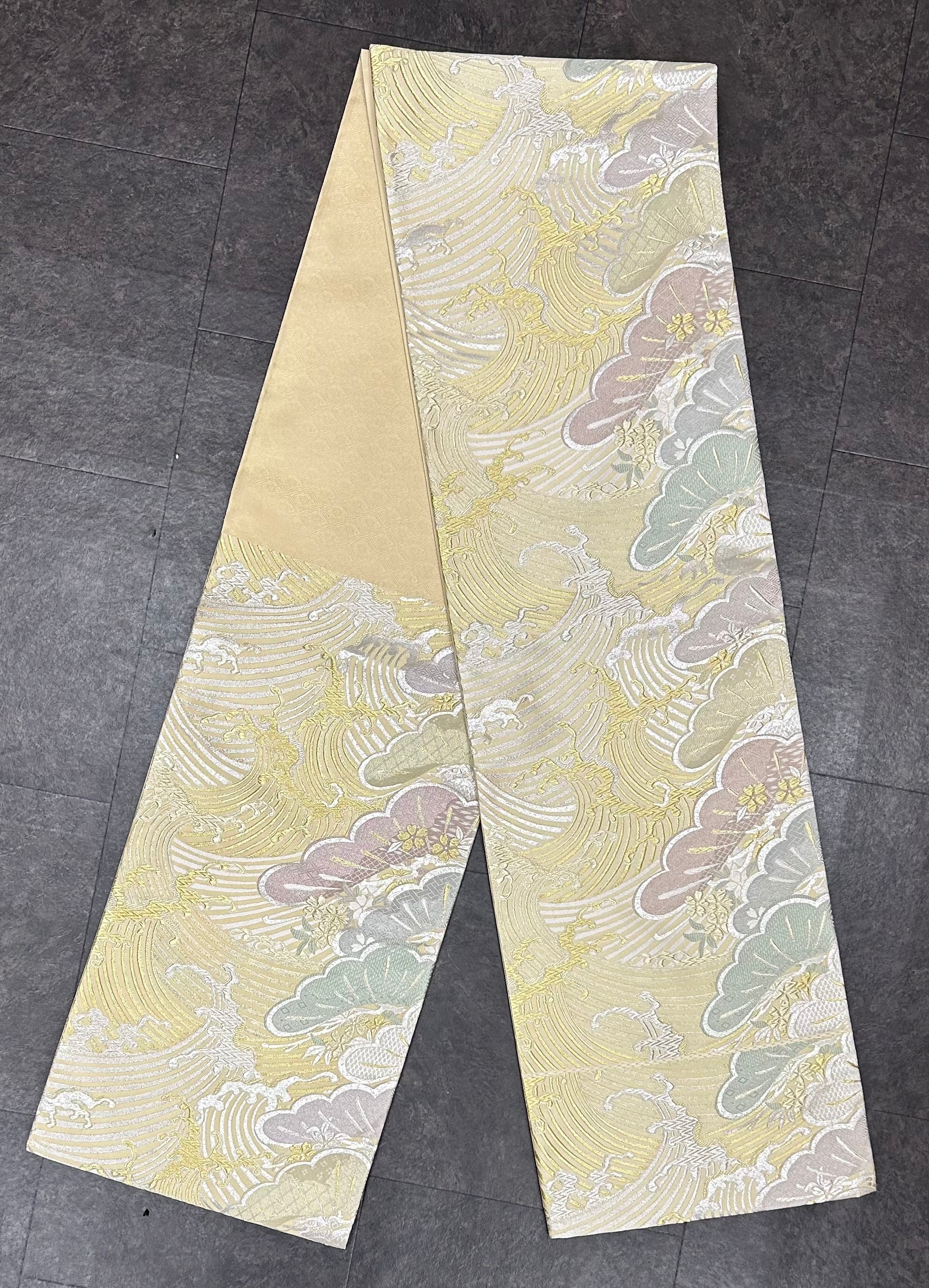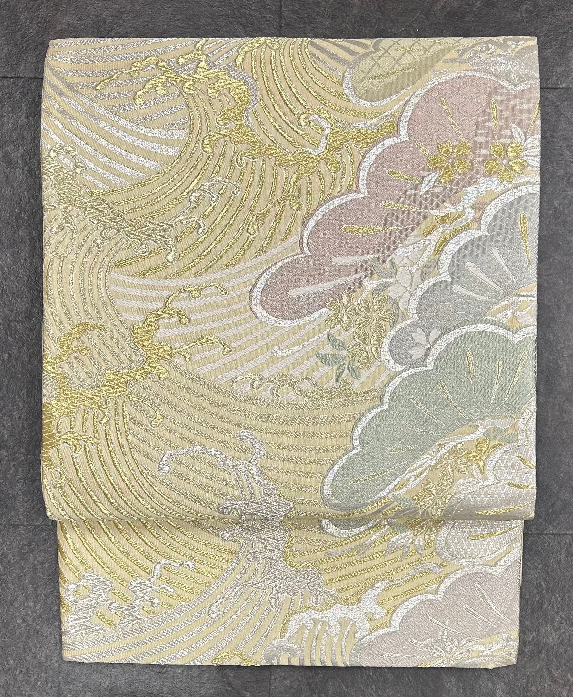砥粉色の地に、金糸、銀糸をふんだんに使い、松の部分に淡い灰梅、薄い秘色、蒸し栗色などが使われている豪華なお品です。「波濤桜花瑞松文」の柄名あり。