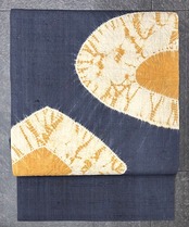 藍鉄色の紬に、黄土色とくすんだ砥粉色の絞りの柄が個性的なやや民芸調のハリnあるお品です。