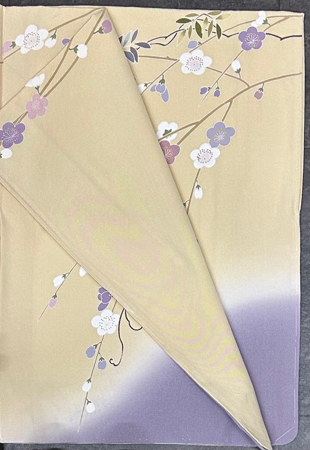 蜂蜜色~薄色の地に とても上品な草花模様が広がる京友禅。ちりめん地のほどよいハリのあるお品です。しつけ糸つき。