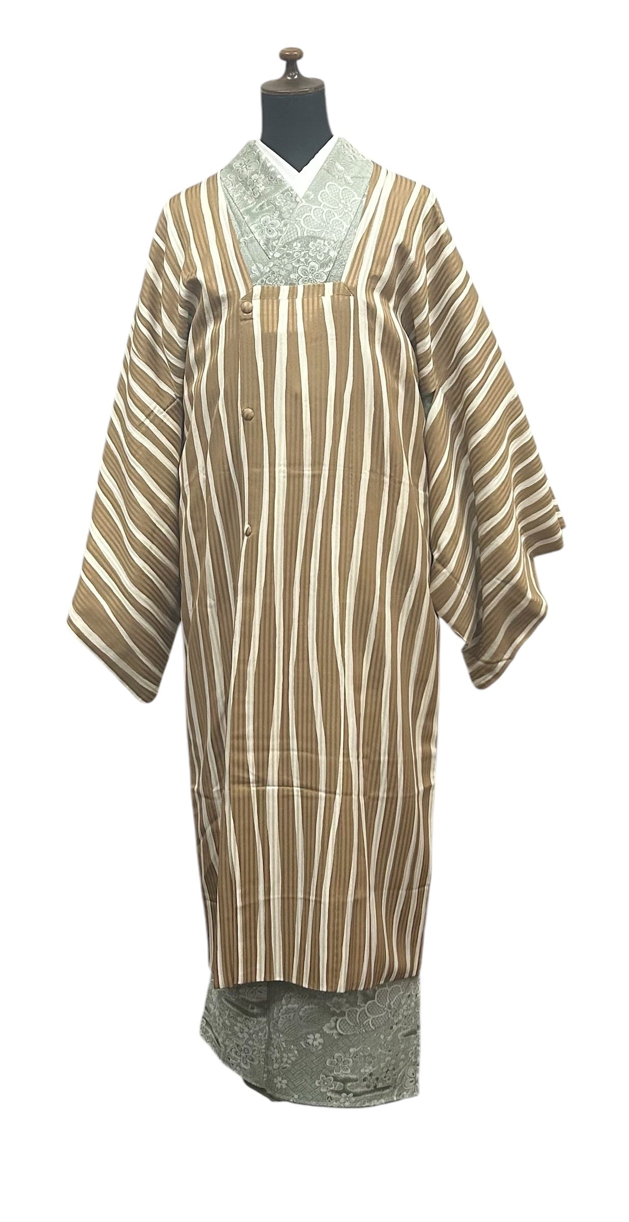 縦縞の地紋のある狐色と黄土色の中間のようなミルクチョコレートカラーと練色の変則的な縦縞の道行です。スラリとした感じの程よい張りとなめらかさがあります。