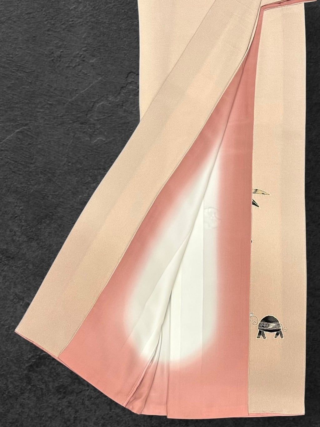 オレンジがかったピンク系の地(一斤染色~裾にかけてときがら茶色)に絞りの象や辻が花、個性的でかわいいお品です。やわらかいちりめん地。