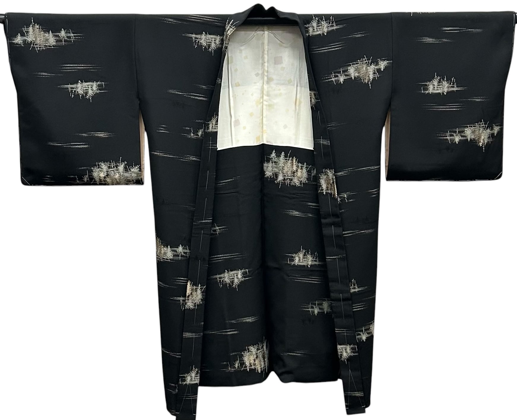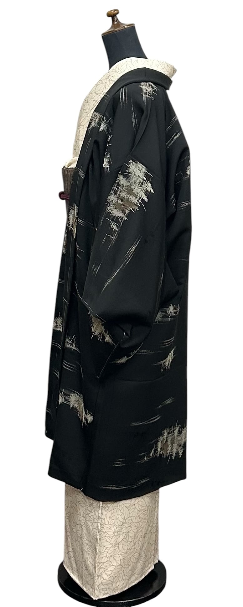 滑らかな黒地に潤色やブロンズ色の木のようにも見える抽象文様がクールな雰囲気のお品です。しつけ糸ついています。