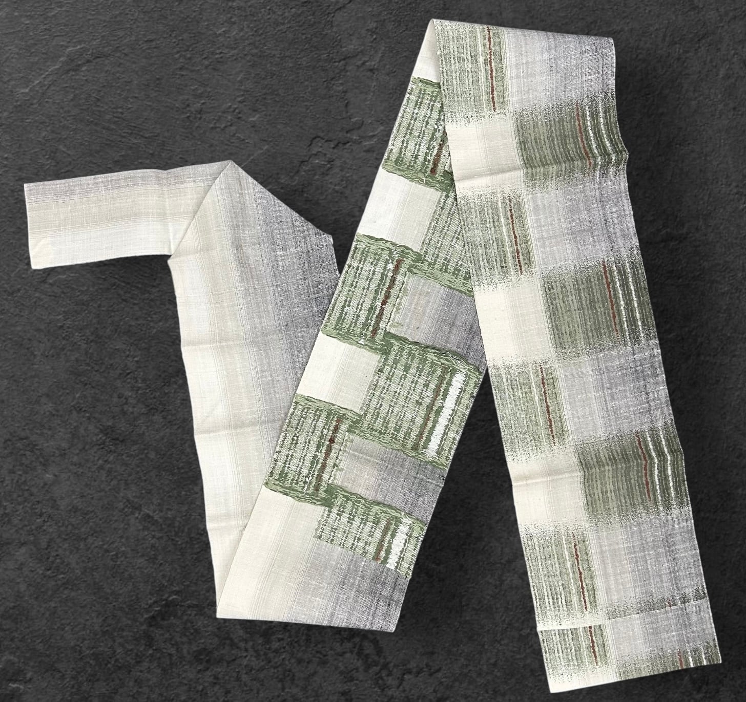 生成り色の地 麹鹿色 海松茶色 小豆色などの市松のような ボリューム感のある織地 フシが浮かぶ軽くザックリとした感触の 渡文さんの証紙のついた八寸名古屋帯です。